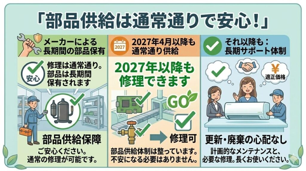 2027年4月以降も新省エネ基準を達成していないエアコンの修理や部品供給は行われます。