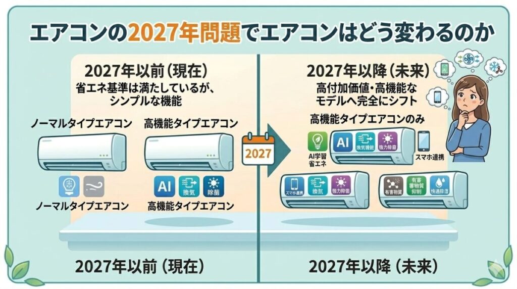 エアコンは毎年2月頃に新しいモデルがメーカーから発表されるので、2027年2月頃には省エネ基準をクリアした価格の高いモデルが店頭に並び始めるでしょう。