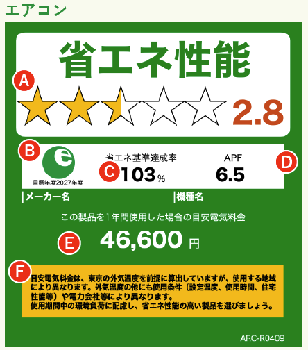 エアコンの省エネ性能を見るときは、統一省ラベルを見ます。