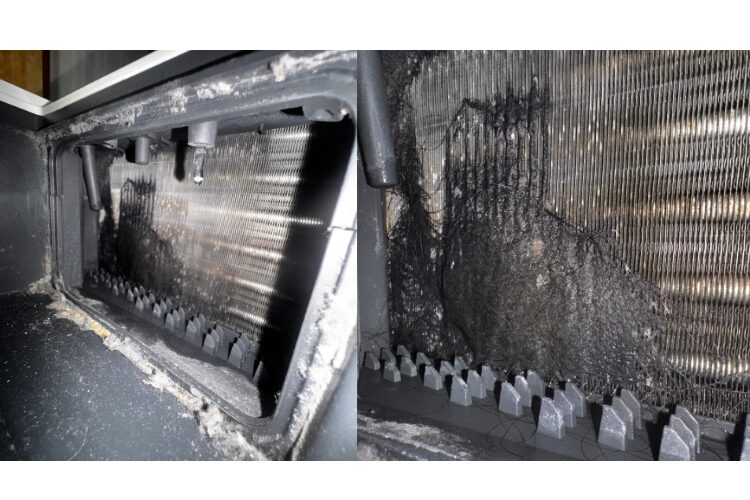 ホコリ、髪の毛、砂などが集まって熱交換器にベットリと張り付いています。