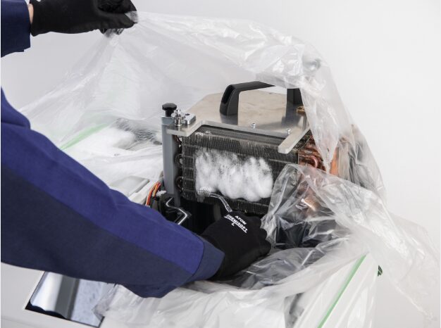 パナソニックの技術員が自宅に訪問して、ヒートポンプユニットの内部にある熱交換器や乾燥経路の水洗い清掃を行うサービスです。