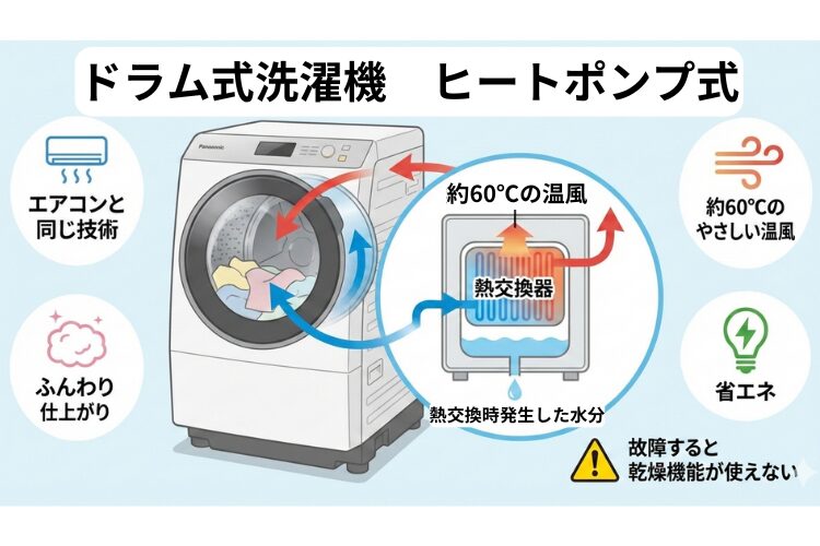 そんな疑問を持っている方のために、ドラム式洗濯機の乾燥を支えるヒートポンプ式の仕組みと役割を簡単にご紹介します。