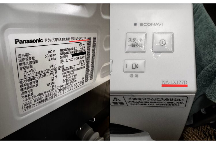 品番は洗濯機に向かって右側面と操作パネルに記載されています。