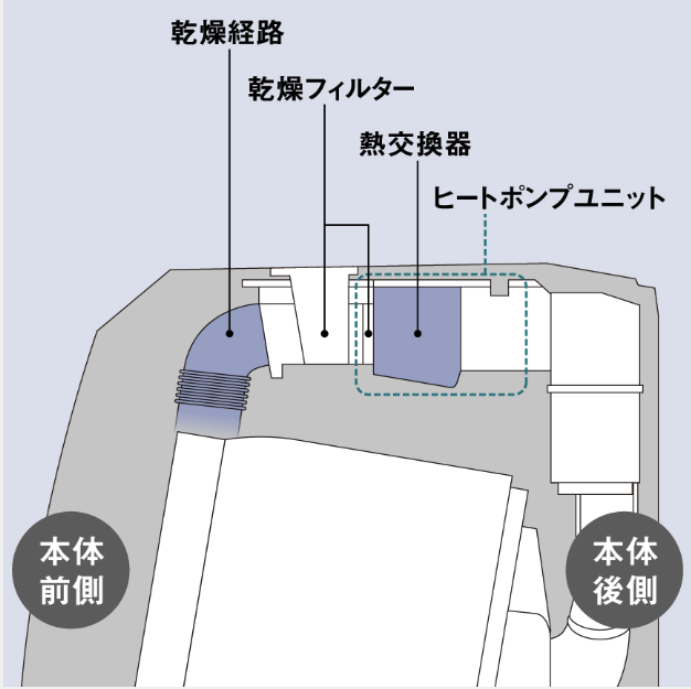 仕組みはエアコンと同じ「ヒートポンプ技術」で高温になりすぎず約60度のやさしい温風で衣類を乾燥させます。