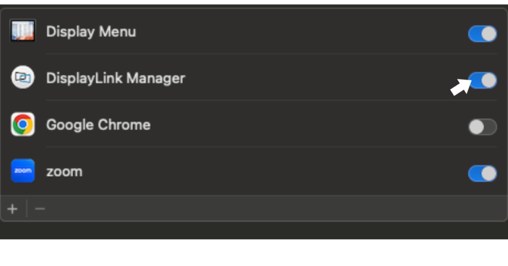 3,リストにある「DisplayLink Manager」のスイッチをON、パスワードなどを求められたら入力する。