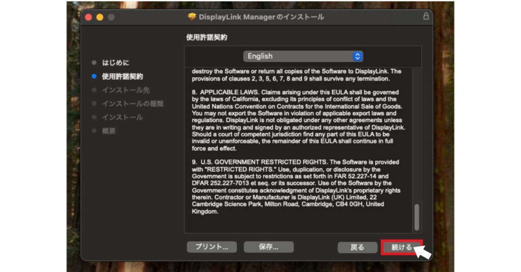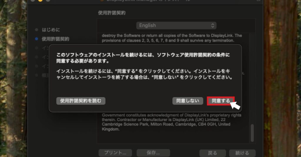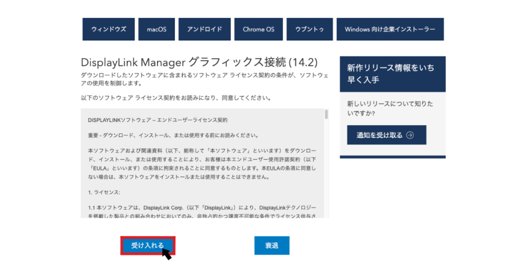 ライセンス契約を最後まで読んだら「受け入れる」をボタン押す。