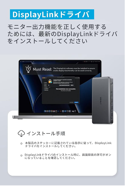 ドッキングステーションはDisplayLink対応のドッキングステーションが必須になります。