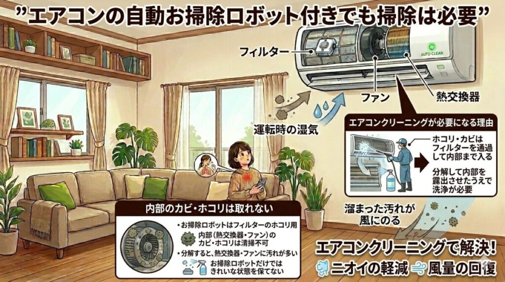 自動で掃除してくれる=エアコン全体がきれいになると思われがちですが、実際には役割がはっきり分かれています。