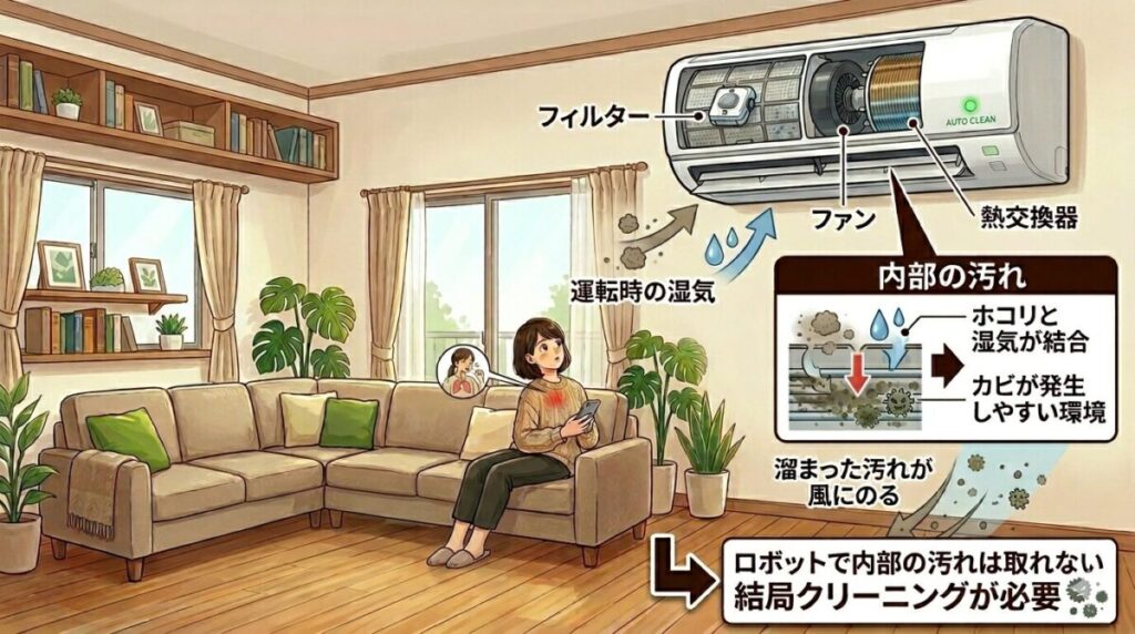 お掃除ロボット付きでも内部にはホコリやカビがかならず付着します。